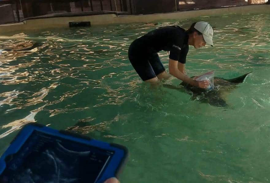 Now the fun begins as we all have so much to learn. The keepers work with the rays daily to desensitize them to the pulse of the probe. As the rays begin to understand what we are expecting of them they become calmer and remain more stationary. We learn where to place the probe, what is the best angle, and of course how to read the images we receive.