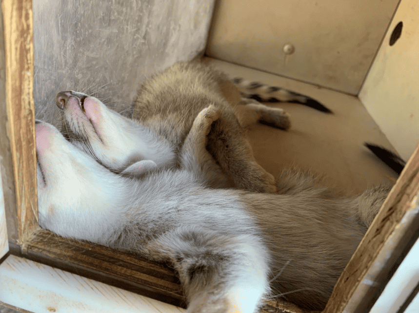 The kits are not yet weaned but they have started to eat solid food. They’re also becoming more mobile and have been seen climbing around their habitat at night… although they still prefer to spend the daytime hours in one of their den boxes. Slate has been a wonderful mother!
